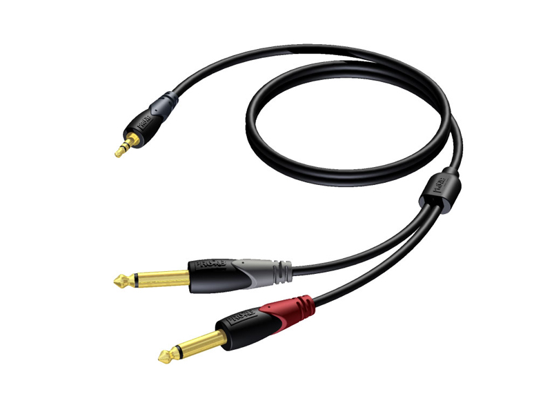 Propojovací audio kabel s konektory 1x Jack 3.5mm Stereo / 2x Jack 6.3mm Mono.
